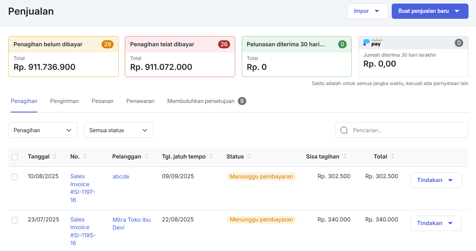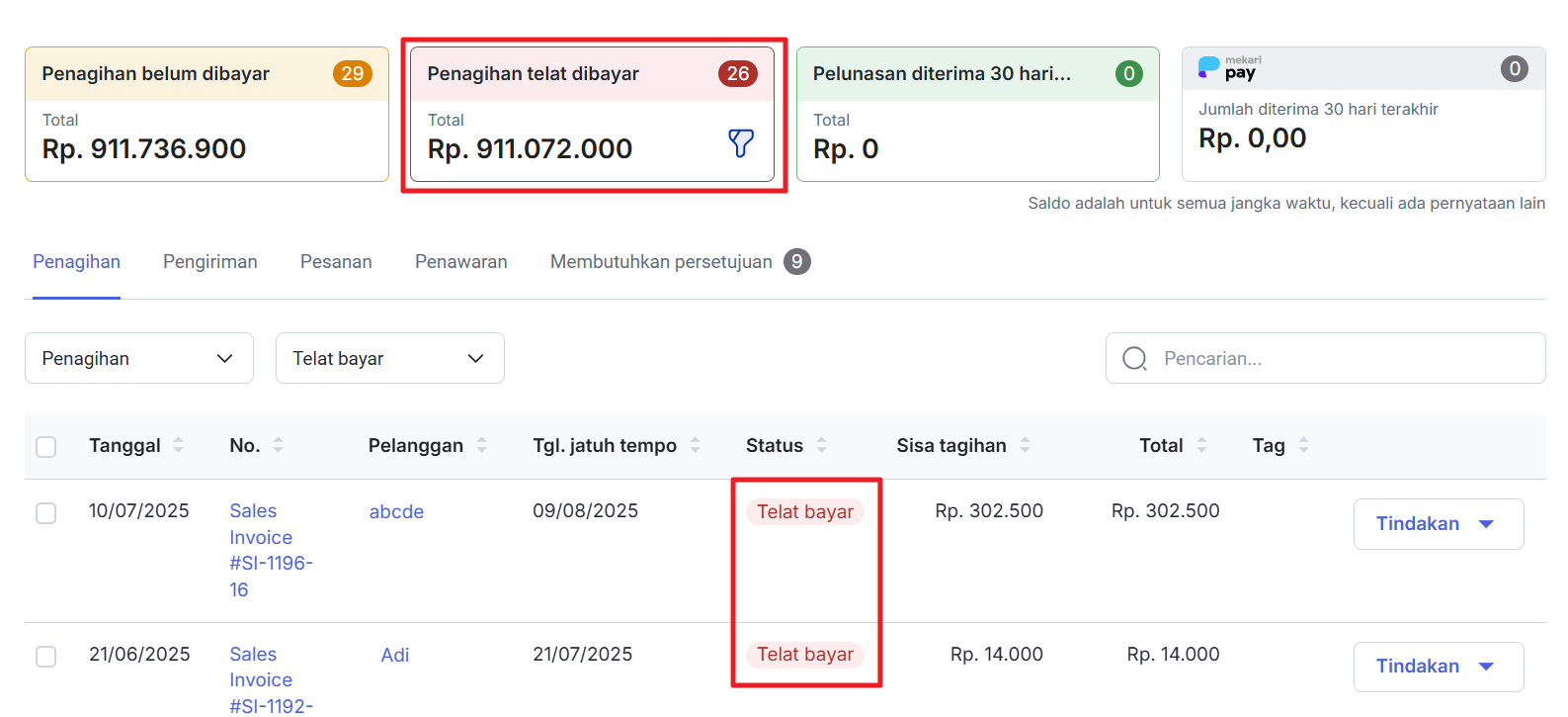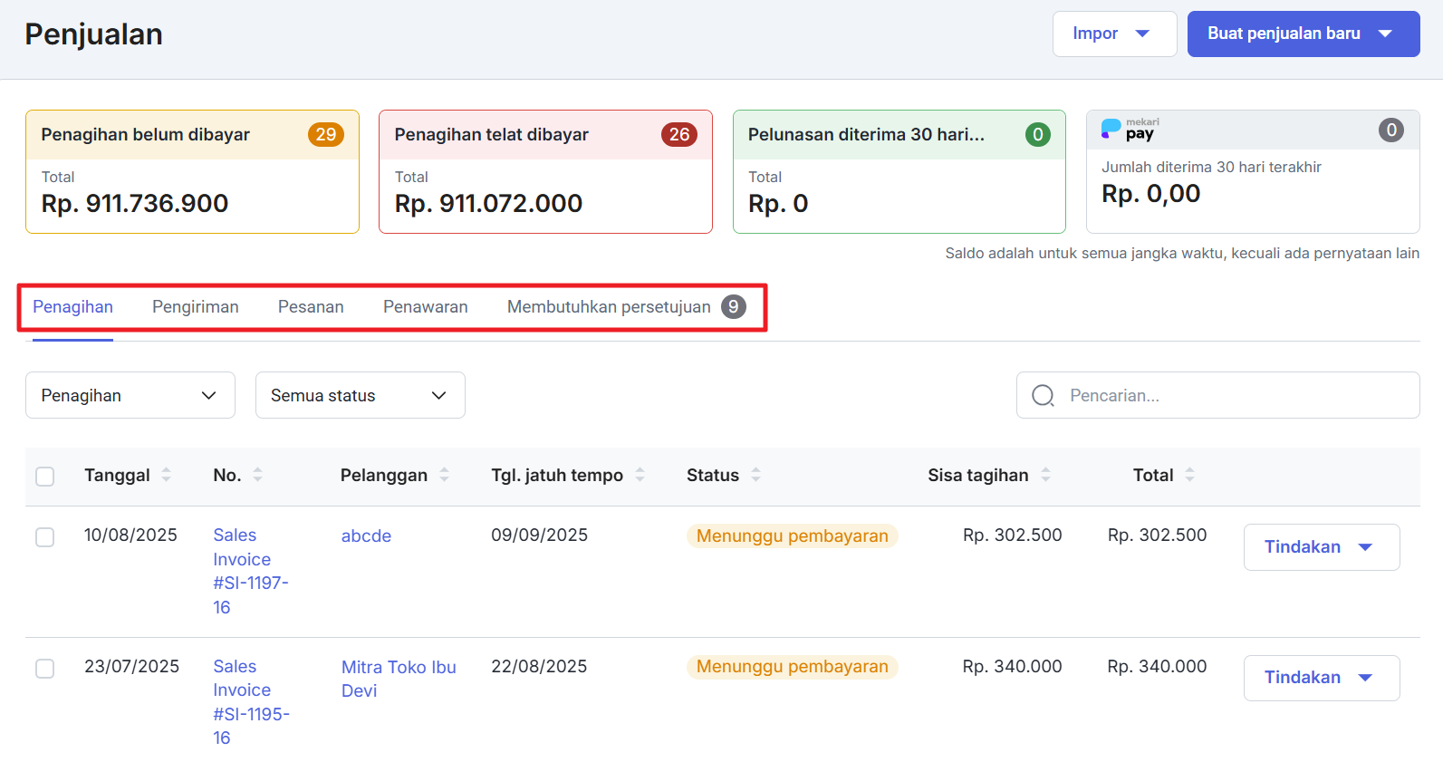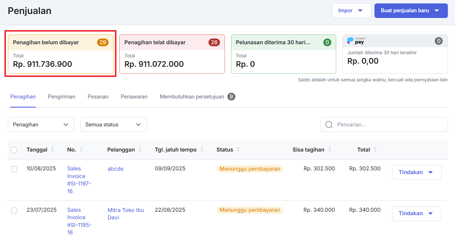 Penjualan Jatuh Tempo (dalam IDR): Penjualan yang sudah jatuh tempo baik sudah terbayar sebagian atau belum terbayar untuk semua jangka waktu. Klik pada angka penjualan di bawah status ini dan Anda akan melihat daftar penjualan yang sudah jatuh tempo.
