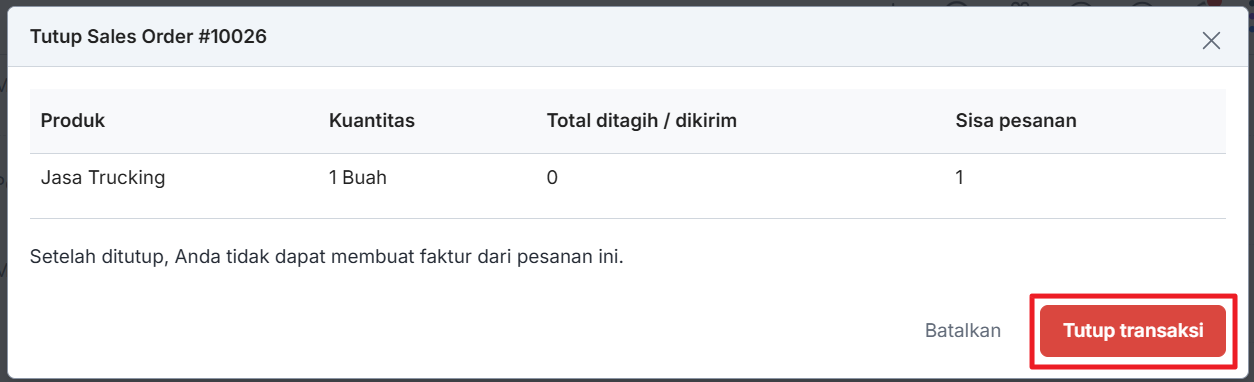 - Anda tetap dapat menutup transaksi pemesanan penjualan walaupun sebagian produk dalam pemesanan penjualan tersebut sudah ditagih/dikirim.