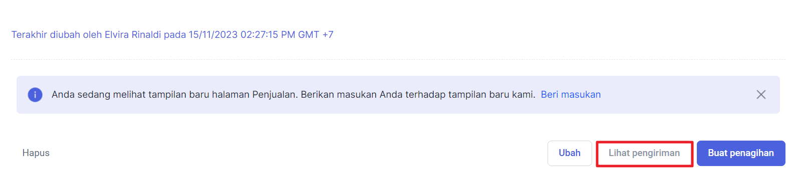- Selanjutnya akan tampil halaman formulir pengiriman penjualan yang telah Anda buat. Klik tombol “Lihat Pengiriman” pada bagian bawah halaman.