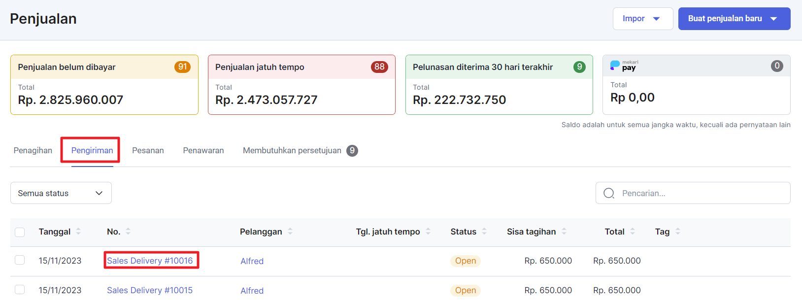 - Klik pada tab “Pengiriman”, lalu klik pada "nomor sales delivery" yang ingin dilihat dan dicetak.