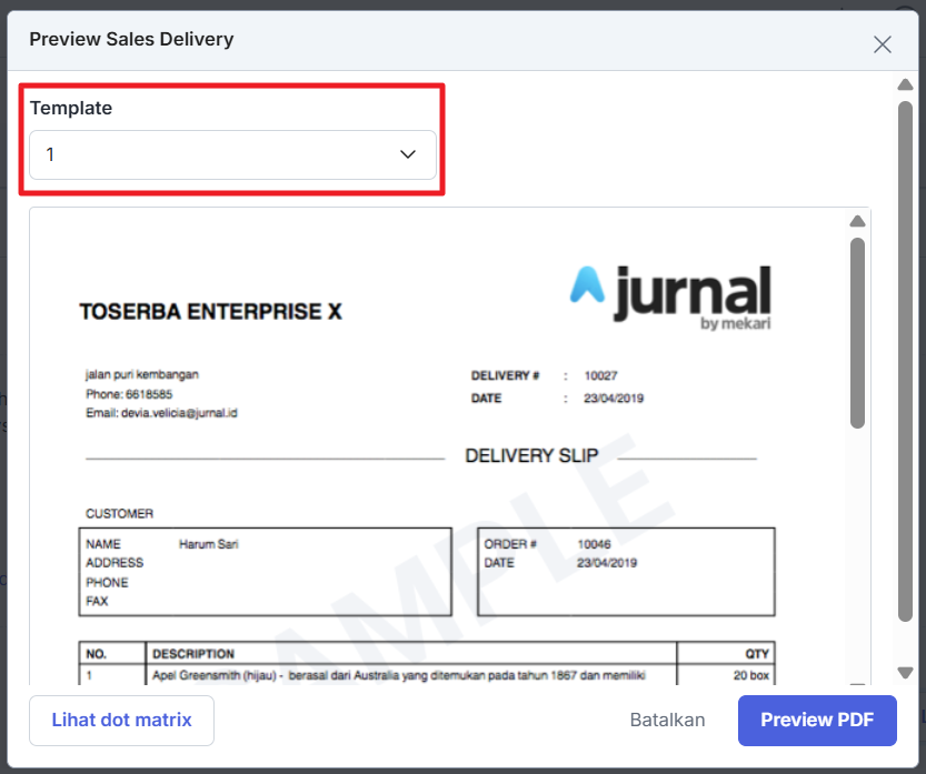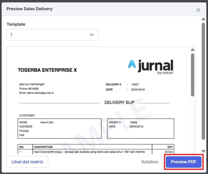 Formulir pengiriman penjualan dapat berfungsi sebagai surat jalan untuk pengiriman barang kepada pelanggan Anda. Setelah formulir pengiriman penjualan Anda terbuat, Anda dapat melihat hasilnya dan mencetak formulir tersebut dengan mengikuti langkah sebagai berikut.