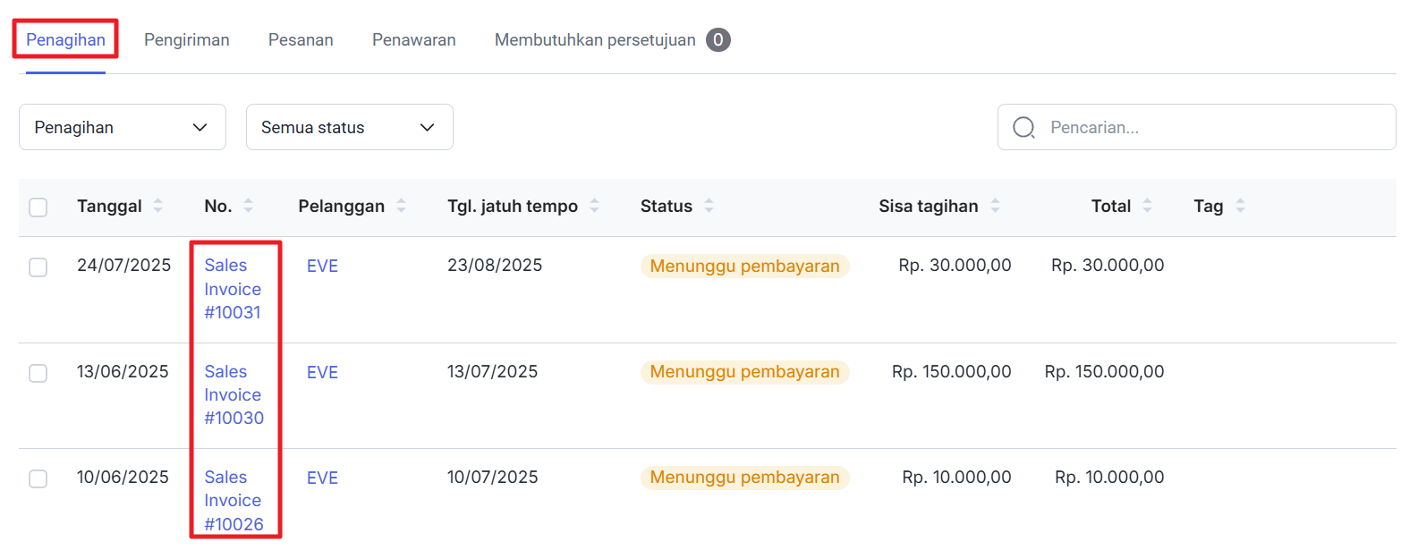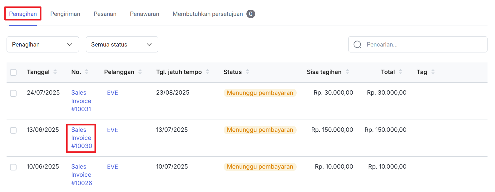 - Pada Pro Forma Invoice, tidak terdapat jurnal entry. Apabila Anda ingin melihat history Pro Forma Invoice, klik “Nomor Invoice”.