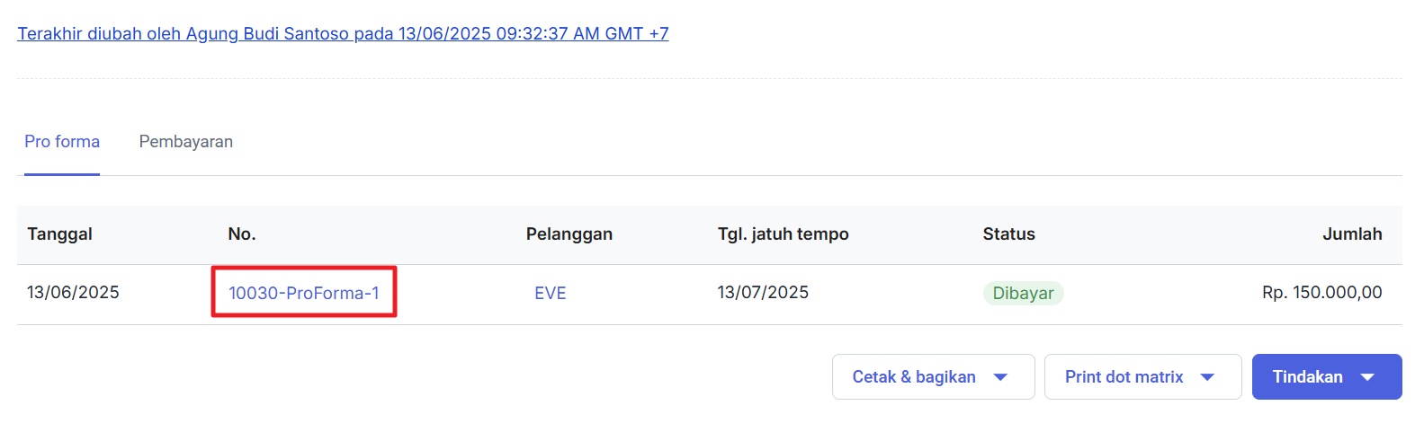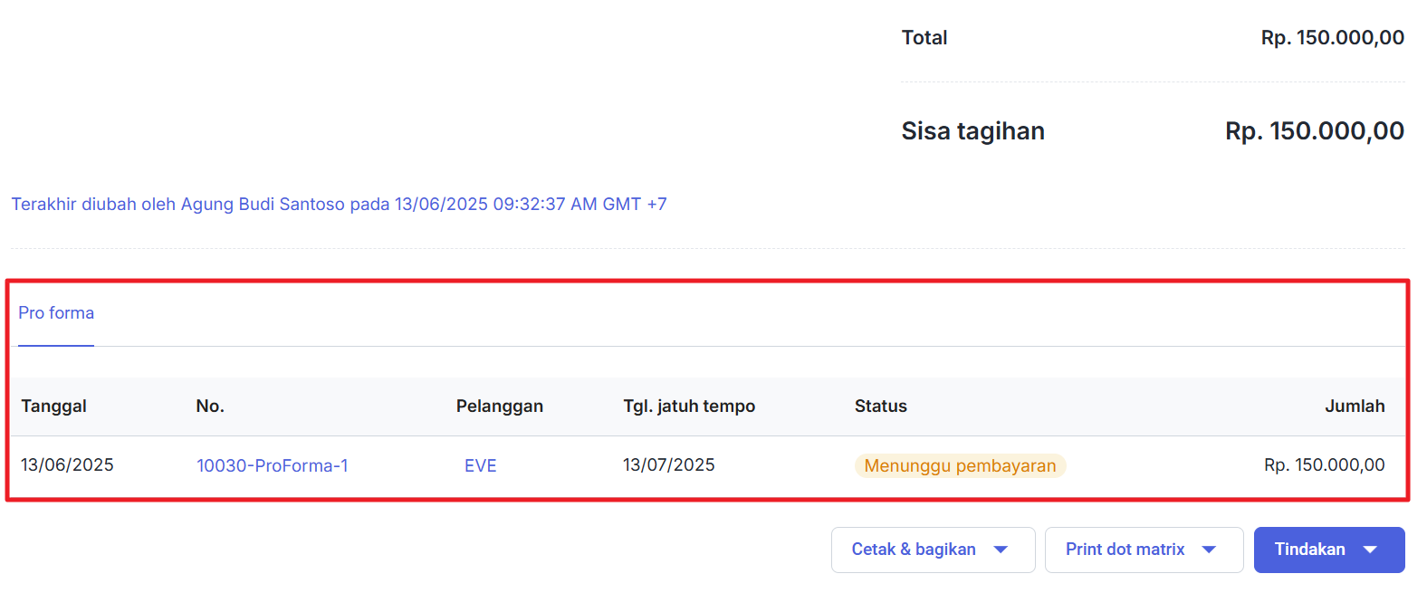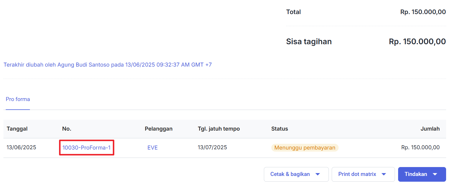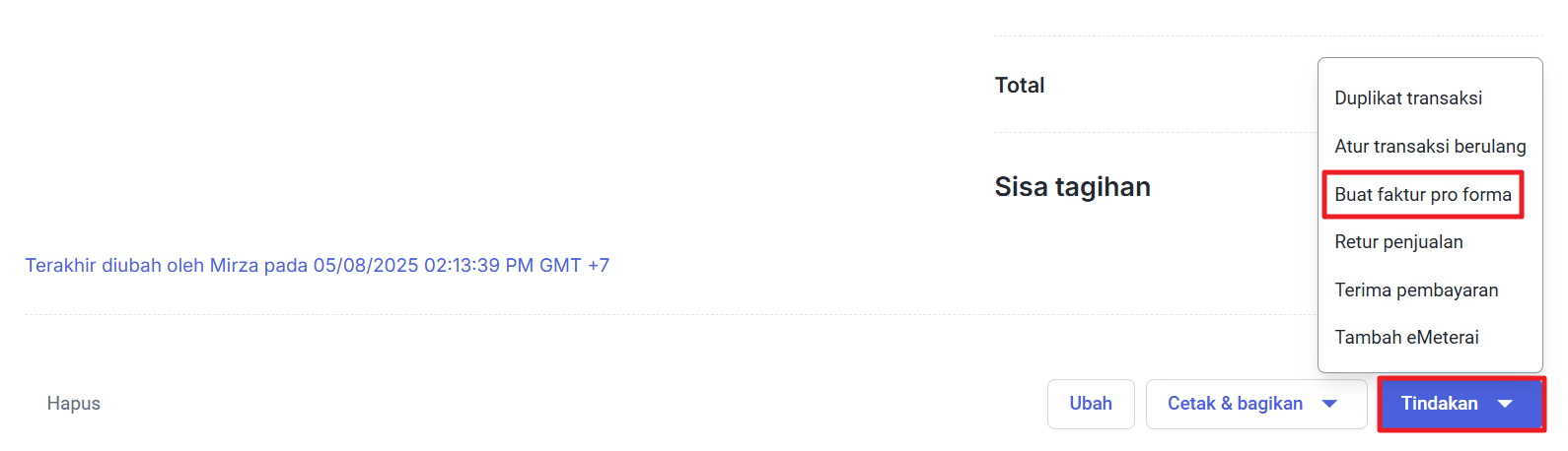 Scroll ke bawah lalu klik tombol “Tindakan” dan pilih Buat faktur pro forma.