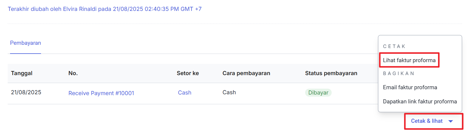 Lalu scroll ke bawah klik “Cetak dan Lihat” lalu pilih Lihat Pro Forma Invoice.