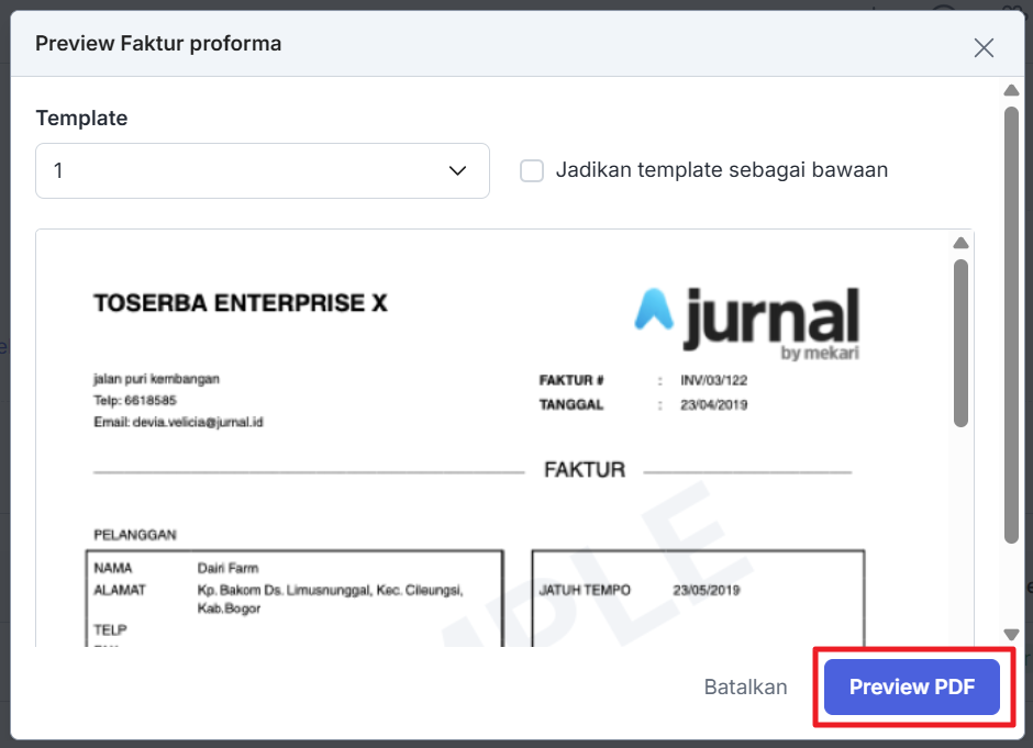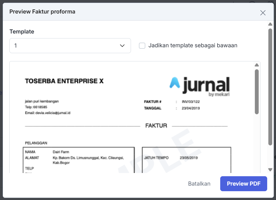 Anda dapat melihat preview invoice yang sudah disediakan oleh jurnal, seperti gambar di bawah.