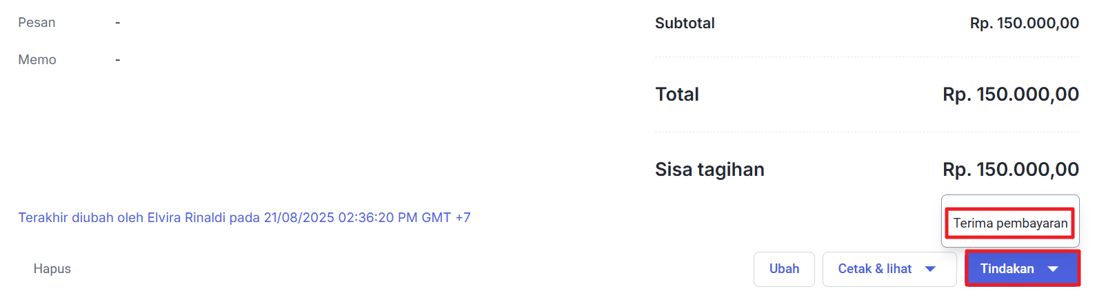 Klik tombol “Tindakan”, lalu klik "Terima Pembayaran".