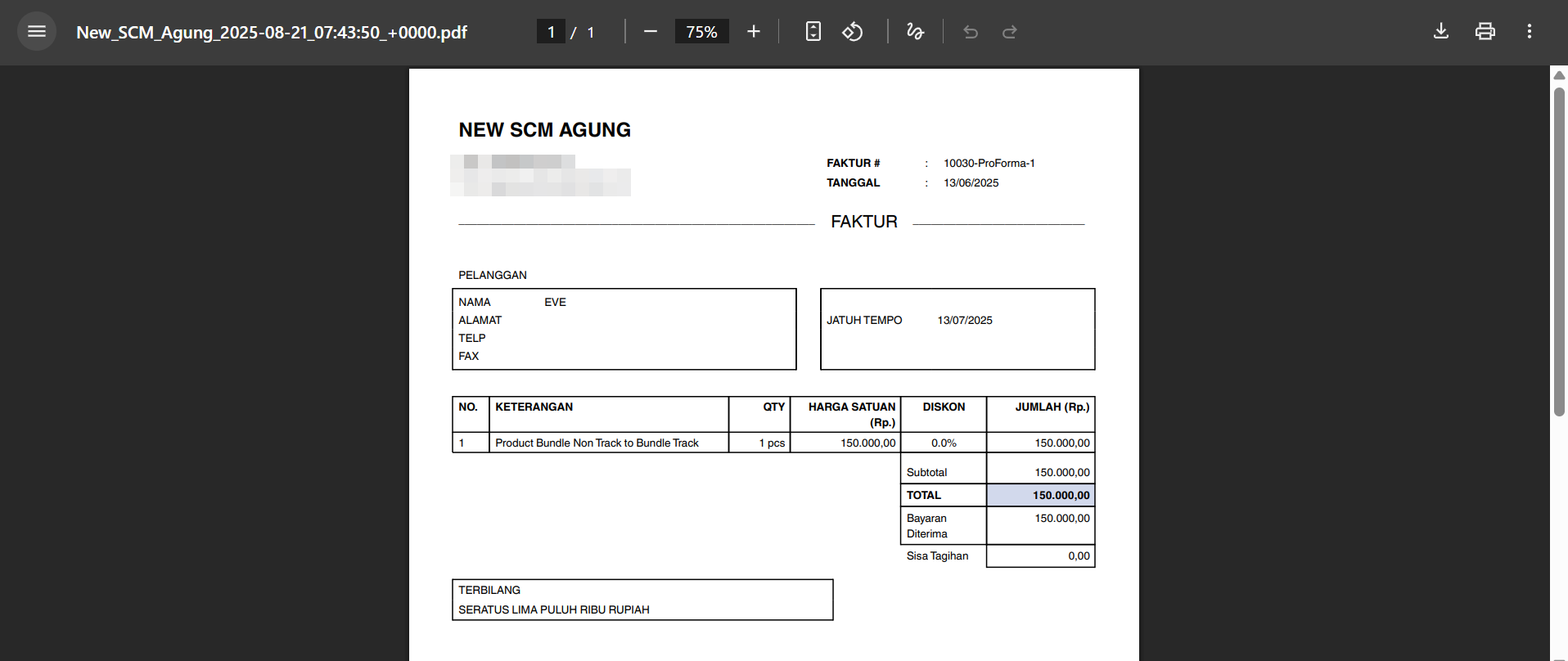 Maka, tampilan faktur yang akan tercetak seperti gambar di bawah.