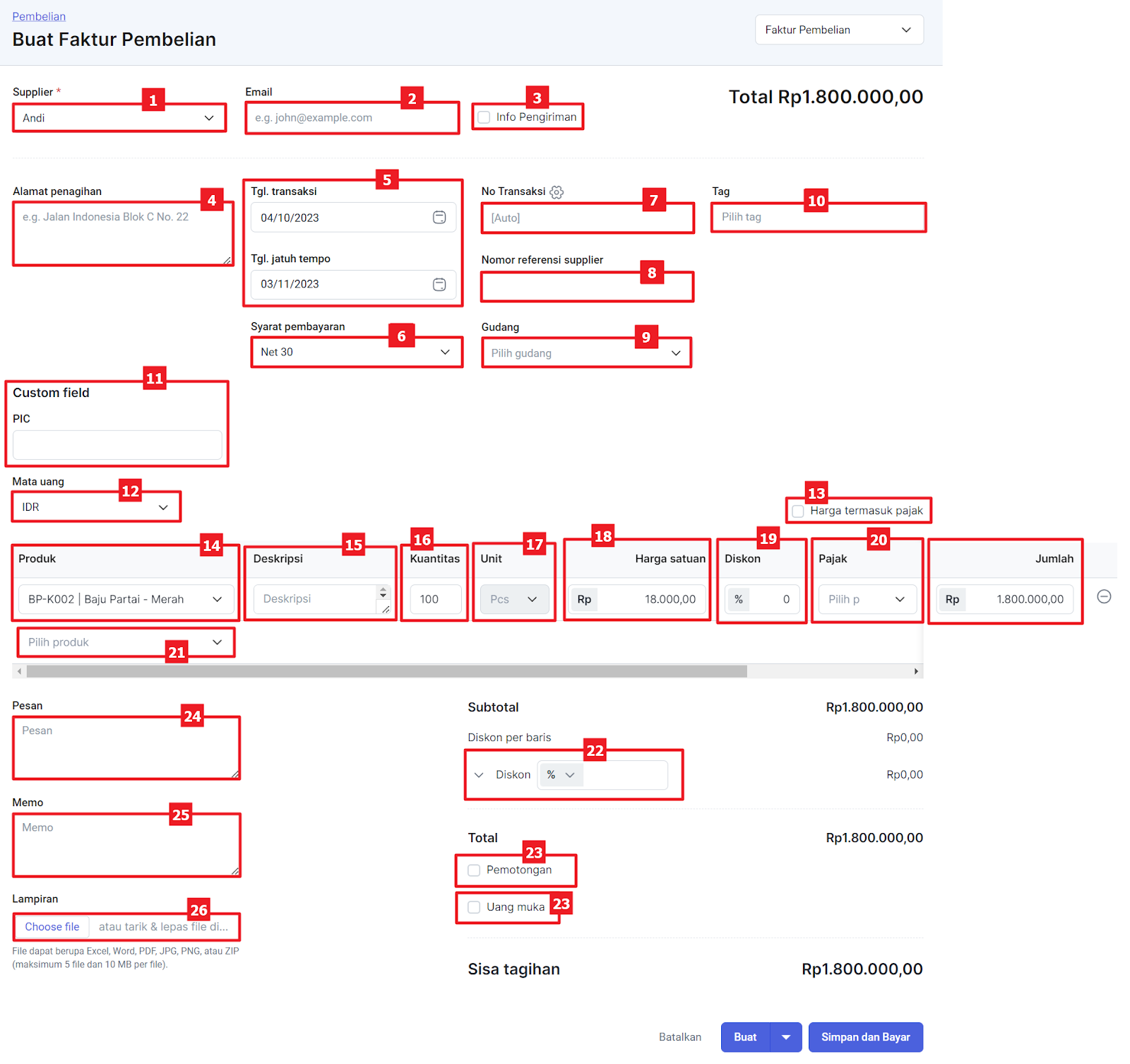 27 Memo Masukkan keterangan tambahan mengenai transaksi pembelian yang akan ditampilkan pada laporan pembelian Anda (tidak tercetak pada invoice).