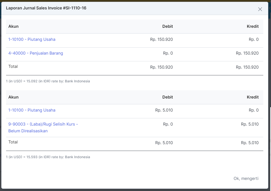 Jika nilai tukar kurs pada transaksi berbeda dengan nilai tukar kurs pada tanggal berjalan, maka Anda akan melihat jurnal entry selisih kurs seperti yang ditampilkan diatas.