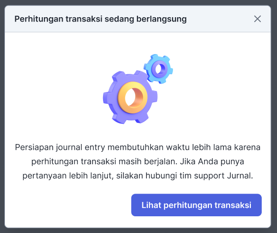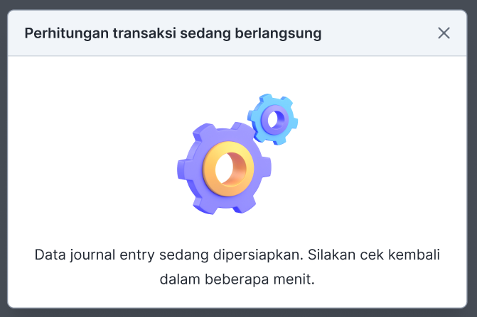 Anda akan melihat tampilan ini saat proses kalkulasi/perhitungan jurnal entry sedang berlangsung. Anda dapat menunggu beberapa saat, sebelum klik “Lihat jurnal entry” kembali untuk melihat apakah jurnal entry telah selesai diterbitkan.