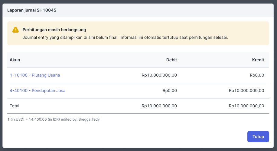 Jika terdapat banner kuning “Perhitungan masih berlangsung”, maka Anda akan melihat jurnal entry yang belum sepenuhnya diterbitkan atau belum final seperti ini. -