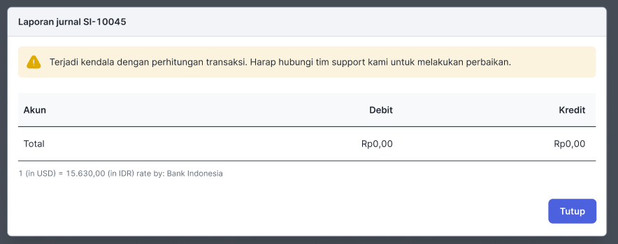 Namun, Anda berpotensi melihat kondisi ini jika membuat transaksi dengan nominal 0. Pastikan jurnal entry yang gagal terbit tidak disebabkan oleh kondisi ini sebelum melaporkan ke tim Support Jurnal.