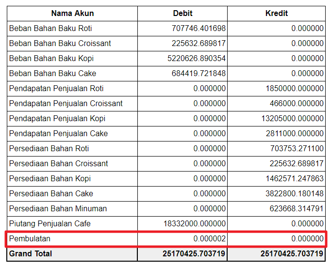 Pada contoh di atas, karena total debit kurang dari total kredit, maka akun pembulatan berada di posisi debit.