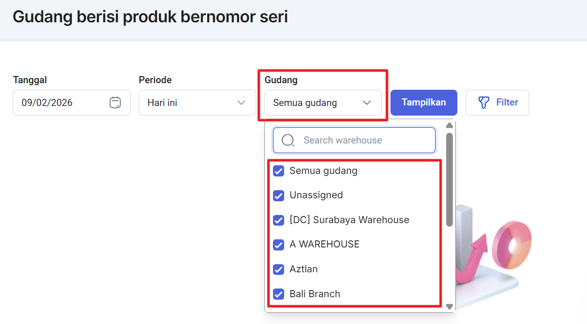 Anda juga dapat memilih gudang mana yang ingin dimunculkan atau Anda juga dapat memilih Semua gudang, jika ingin memunculkan informasi dari semua gudang.