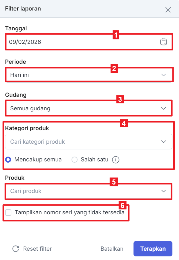 5 Produk Anda dapat memfilter laporan berdasarkan semua produk atau produk yang memiliki serial number. 6 Tampilkan nomor seri yang tidak tersedia Centang ini jika ingin menampilkan nomor seri yang sudah tidak diaktifkan. -