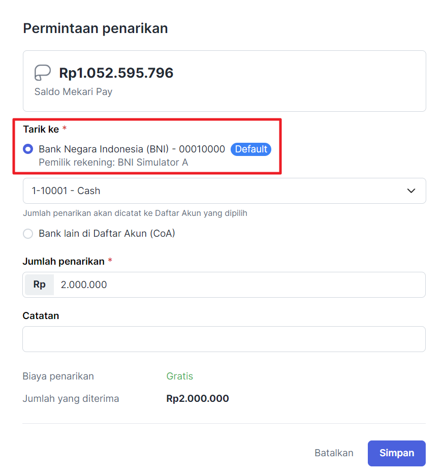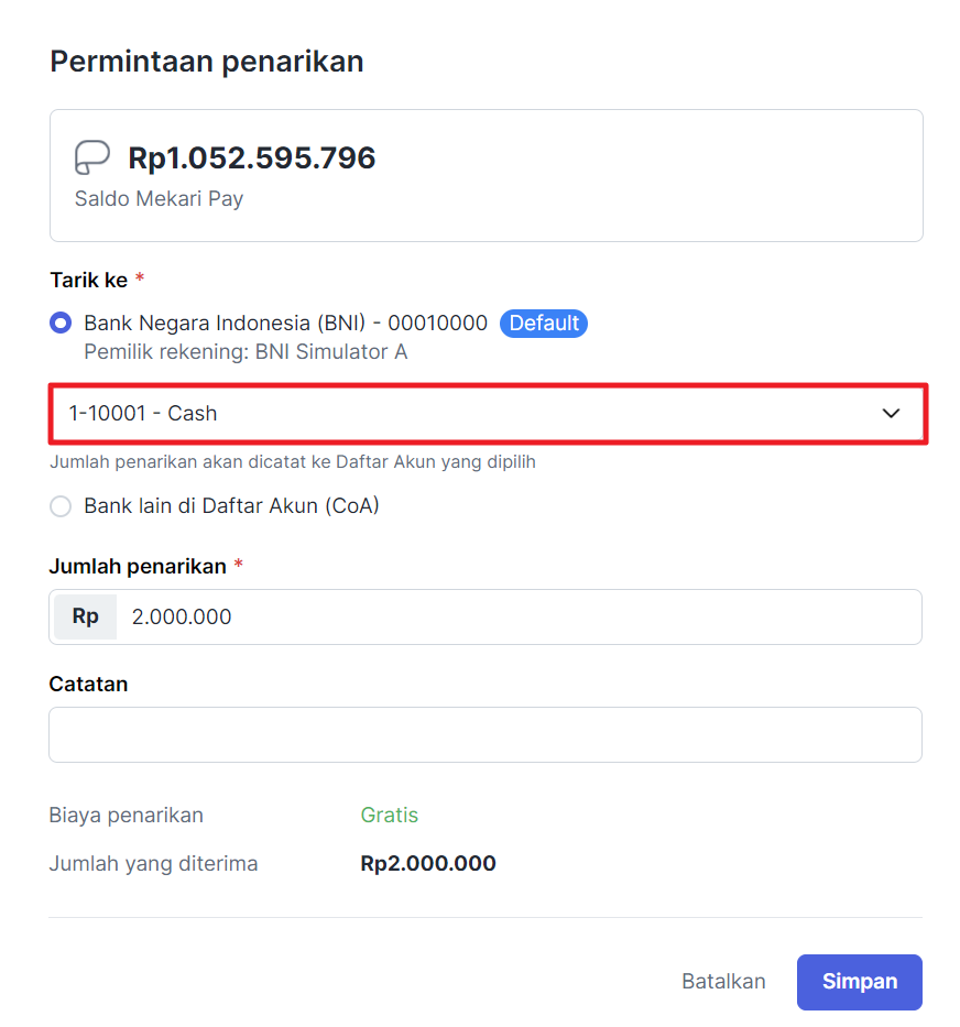 - Pastikan Anda telah menambahkan nomor rekening bank pada menu Cash & Bank untuk melakukan penarikan dana ke akun bank lainnya.