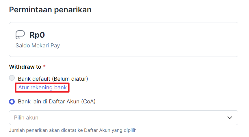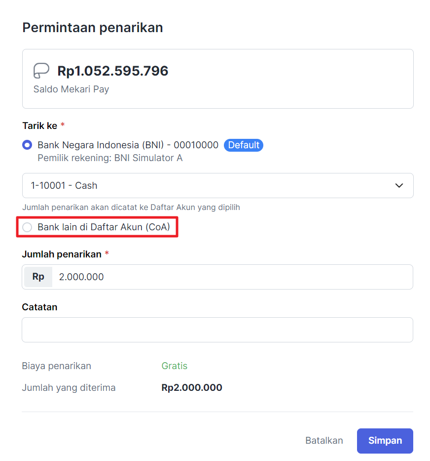 Jika Anda melakukan penarikan dana ke akun bank lainnya, selanjutnya pilih Bank lain di Daftar Akun CoA yang sudah memiliki rekening bank.