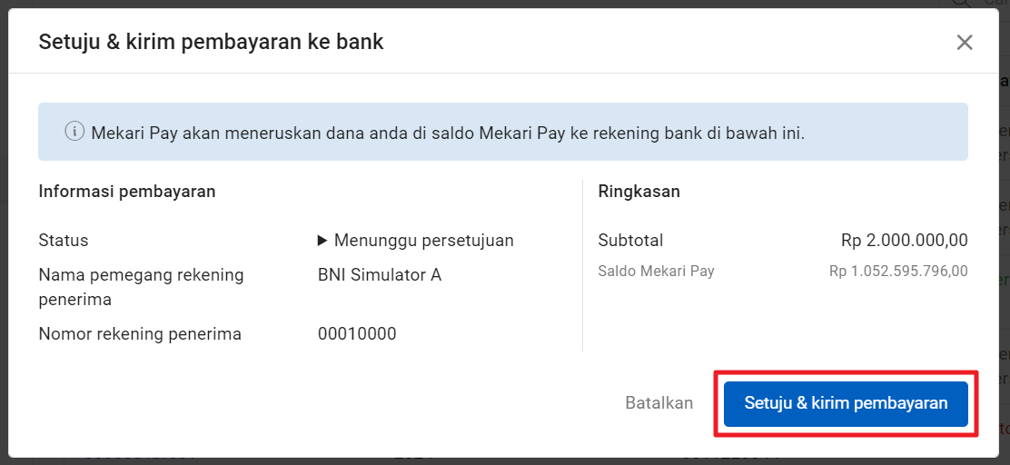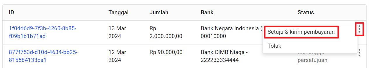 Apabila Anda memiliki role sebagai Approver atau Releaser, Anda dapat melakukan approval untuk request yang penarikan dana yang masuk, dengan klik ikon “titik tiga” pada withdrawal request dengan status “Pending Approval” lalu klik “Setuju & kirim pembayaran”.