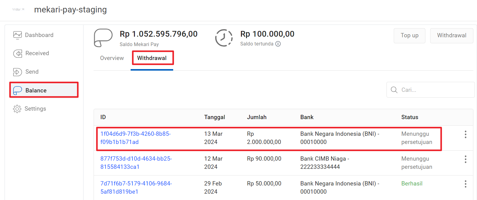 - Pending Approval: Request penarikan dana masih menunggu Approval.
