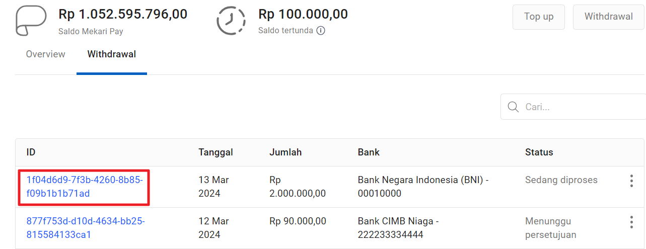 - Untuk melihat detail dari proses penarikan saldo, Anda dapat klik ID transaksi.