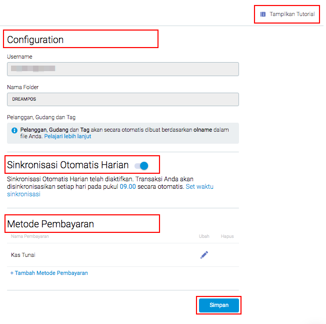 - Selanjutnya, Anda akan dibawa ke layar Pengaturan Koneksi seperti gambar berikut. Lakukan pengaturan untuk konfigurasi, sinkronisasi otomatis, serta metode pembayaran.