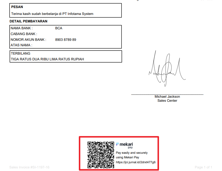 Maka hasil PDF invoice penjualan dengan QR Code dan link payment sebagai berikut.